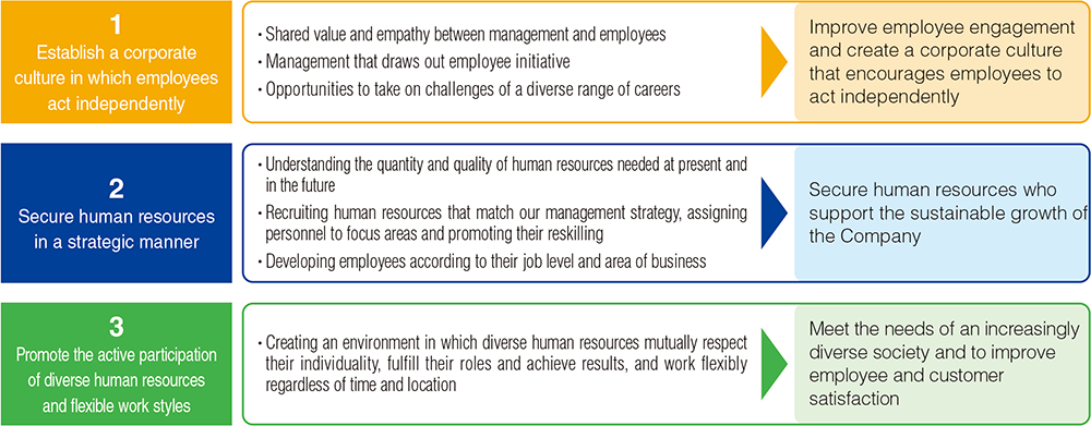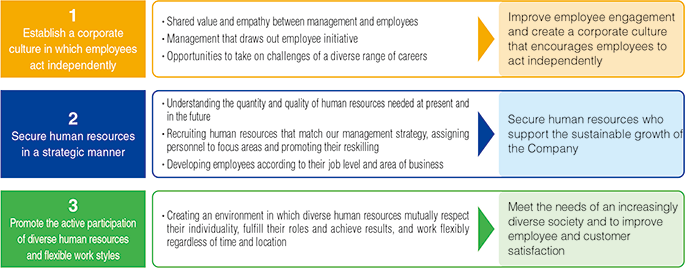 The "Three Basic Principles of Human Capital Management" are linked to our management strategy, and we aim to realize our management strategy and increase our corporate value by promoting the following initiatives in line with this philosophy.