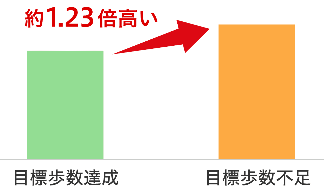 ウォーキングの重要性は統計データからもあきらかで、1日の目標歩数を達成していない人は、達成している人に比べてBMIが異常値である割合が1.23倍高いことが分かりました。