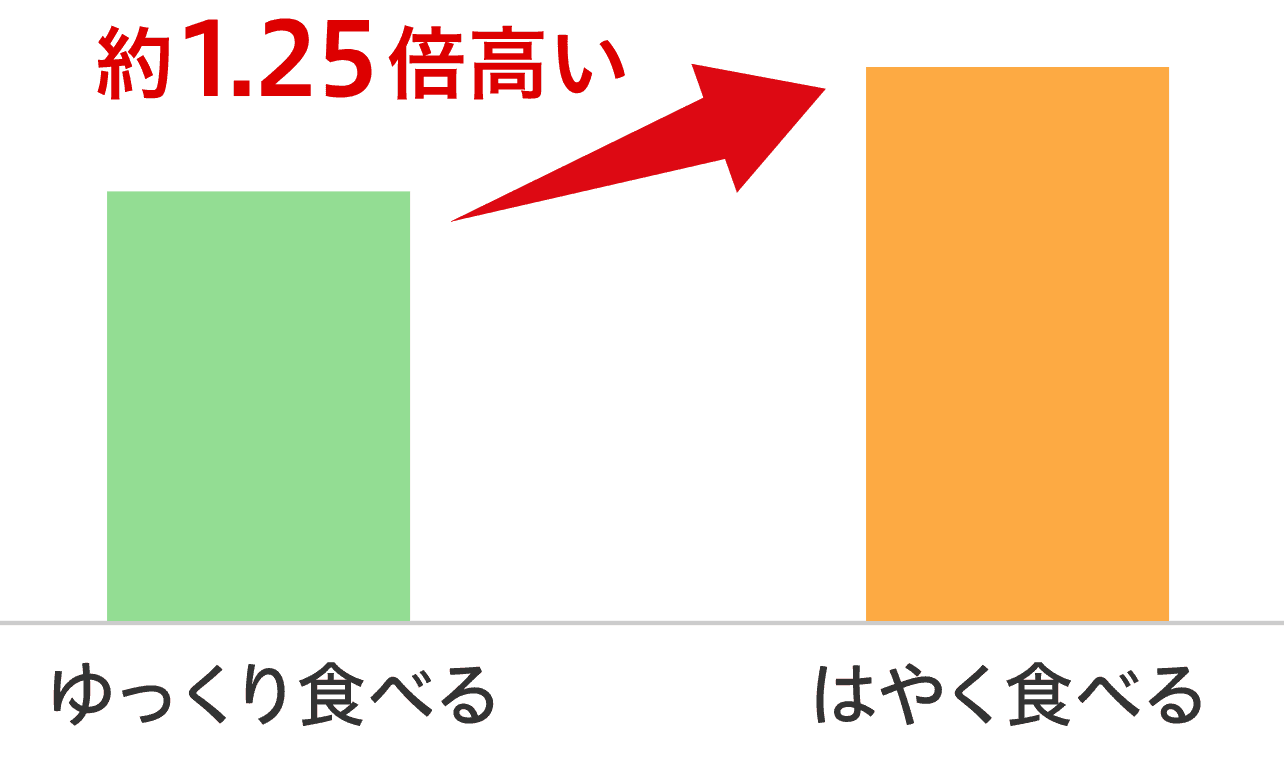 「たかが早食いでしょ?」と侮っていると危険!なんと、人と比べて「食べる速度が速い」人は「食べる速度が遅い」人に比べて、BMIが異常値である割合が1.25倍高いことが分かりました。