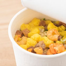 - 厚さ8㎜ほどに切ったかぼちゃ、2cmに角切りしたトマト、一口サイズに乱切りしたピーマン、しめじは手でほぐし、小分けしておきます。豚肉は酒大さじ1杯(分量外)を振っておきます。