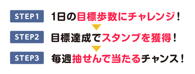 STEP1:1日の目標歩数にチャレンジ! STEP2:目標達成でスタンプを獲得! STEP3:毎週抽せんで当たるチャンス!