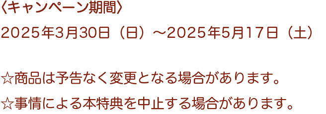 〈キャンペーン期間〉2025年3月30日(日)~2025年5月17日(土) ☆商品は予告なく変更となる場合があります。 ☆事情による本特典を中止する場合があります。