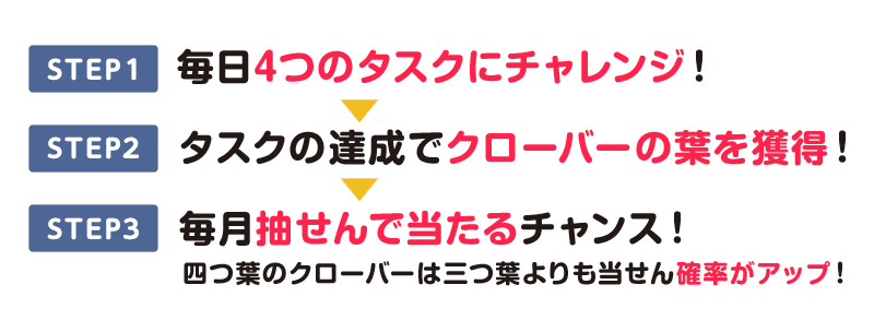 STEP1:毎日4つのタスクにチャレンジ! STEP2:タスクの達成でクローバーの葉を獲得! STEP3:毎週抽せんで当たるチャンス!四つ葉のクローバーは三つ葉よりも当せん確率がアップ!