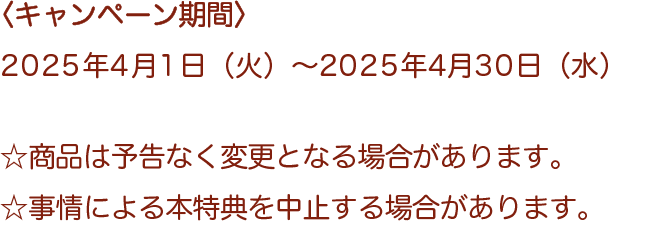 〈キャンペーン期間〉2025年4月1日(火)~2025年4月30日(水) ☆商品は予告なく変更となる場合があります。 ☆事情による本特典を中止する場合があります。