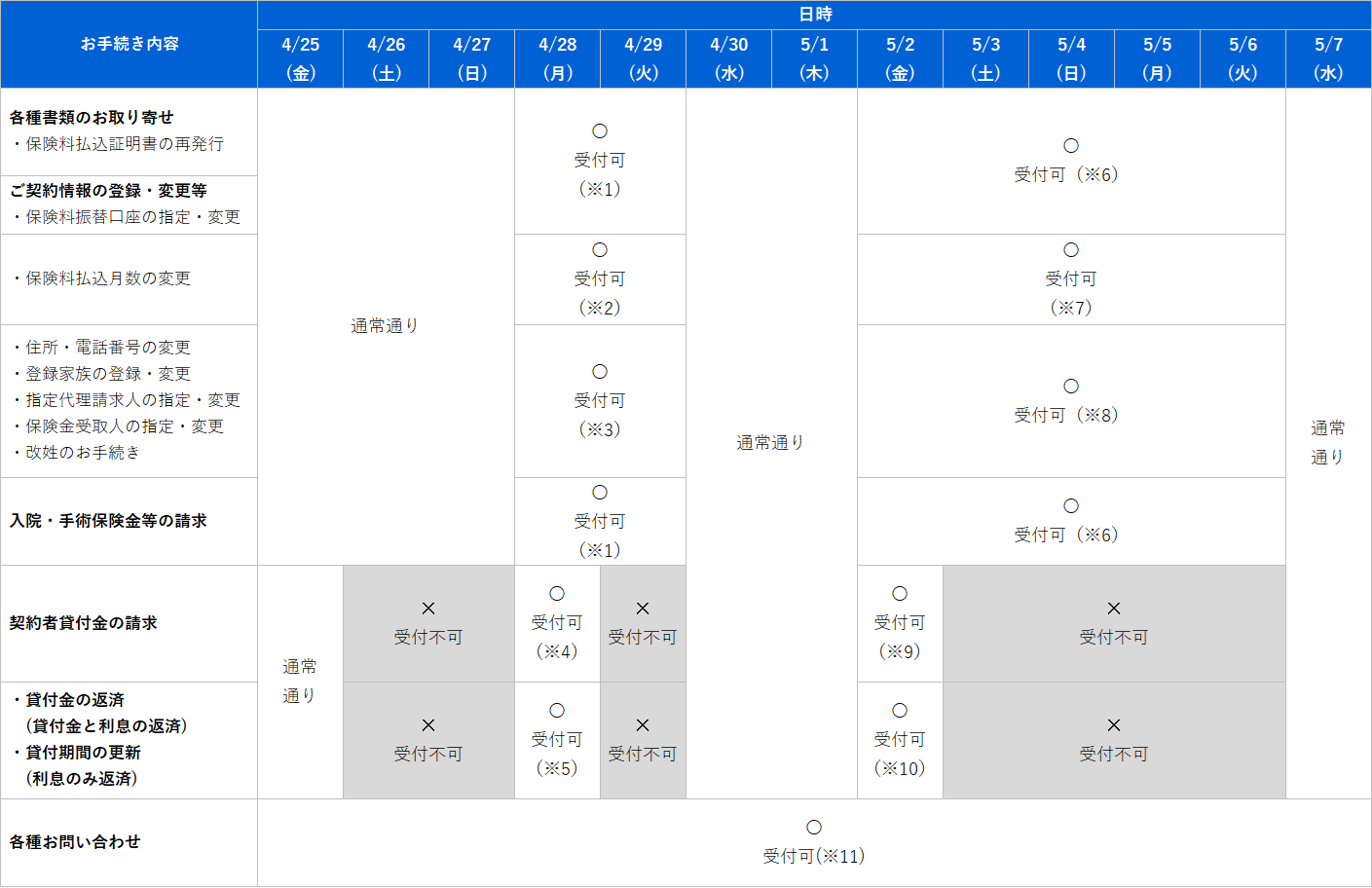 契約者貸付金の請求、貸付金の返済、および貸付期間の更新以外のお手続きについては以下の表のとおり受付可能となりますので、ぜひご利用ください。