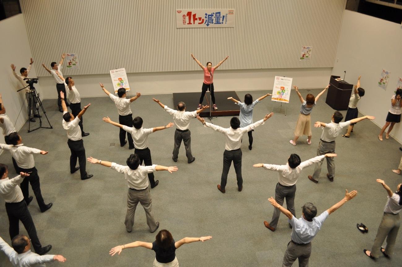 (左)企業でのラジオ体操ワンポイントレッスンの様子