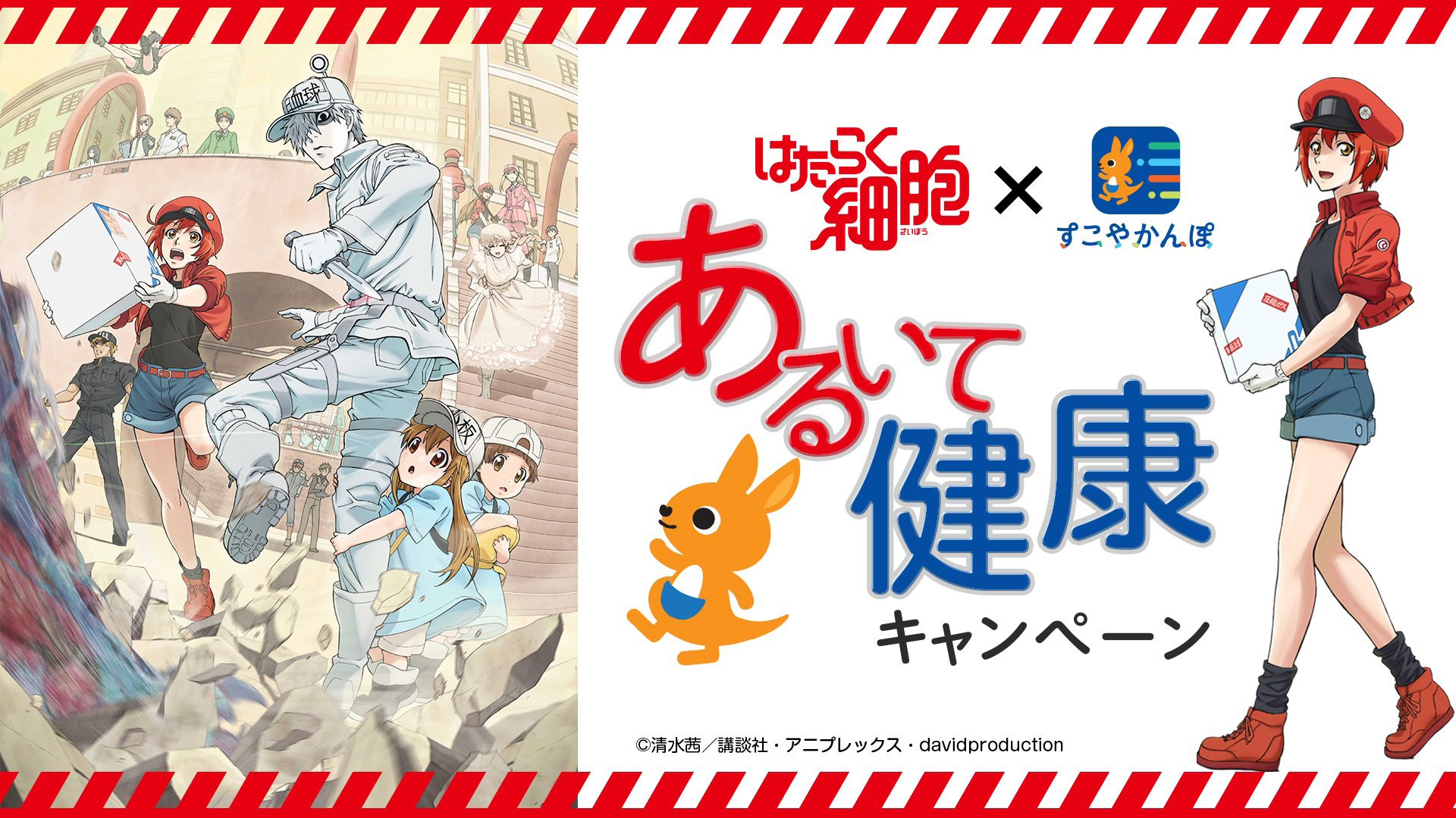 今回は擬人化された細胞たちの姿を描く人気アニメ「はたらく細胞」とコラボレーションし、歩くことやラジオ体操等、運動習慣の大切さを伝えてまいります。