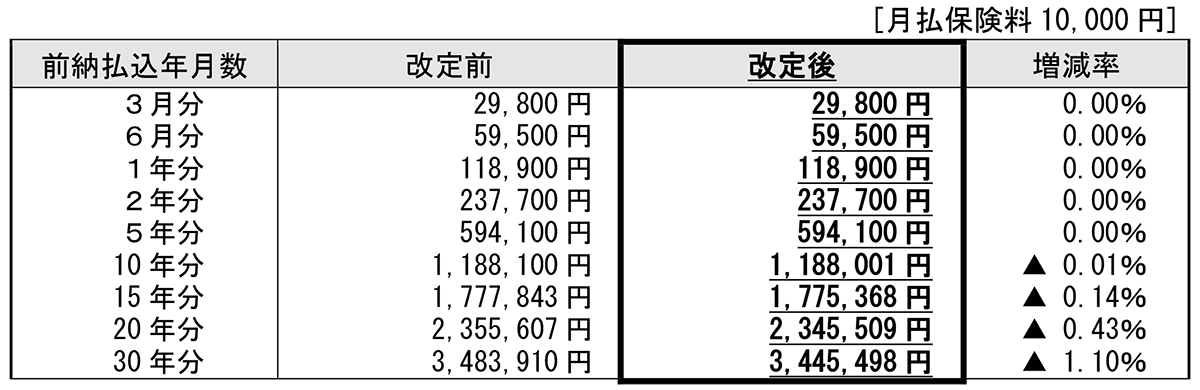 2022年4月1日以降に保険料の前納払込みをしていただく場合の前納払込保険料について改定します。ただし、2022年3月31日までに新規契約を申込みいただき、申込時にご指定いただいた払込年月数どおりに、第1回保険料を含む保険料の前納払込みをしていただく場合は、払込時期が4月1日以降であっても改定前の前納払込保険料を適用します。