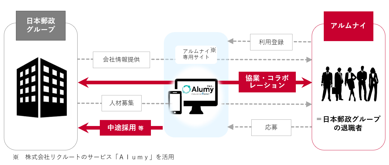 日本郵政株式会社(東京都千代田区、取締役兼代表執行役社長 増田 寬也)、日本郵便株式会社(東京都千代田区、代表取締役社長兼執行役員社長 衣川 和秀)、株式会社ゆうちょ銀行(東京都千代田区、取締役兼代表執行役社長 池田 憲人)および株式会社かんぽ生命保険(東京都千代田区、取締役兼代表執行役社長 千田 哲也)は、日本郵政グループ(以下、「当グループ」)の中期経営計画「JPビジョン2025」に掲げる、お客さまと地域を支える「共創プラットフォーム」の一環として、当グループを退職した元社員に活躍してもらうことを目的としたグループ横断のアルムナイネットワークを構築しますので、お知らせします。当ネットワークを退職者協働のプラットフォームとして、これまでの関係性を活かし、元社員との協業・コラボレーションや中途採用などを進めていきます。