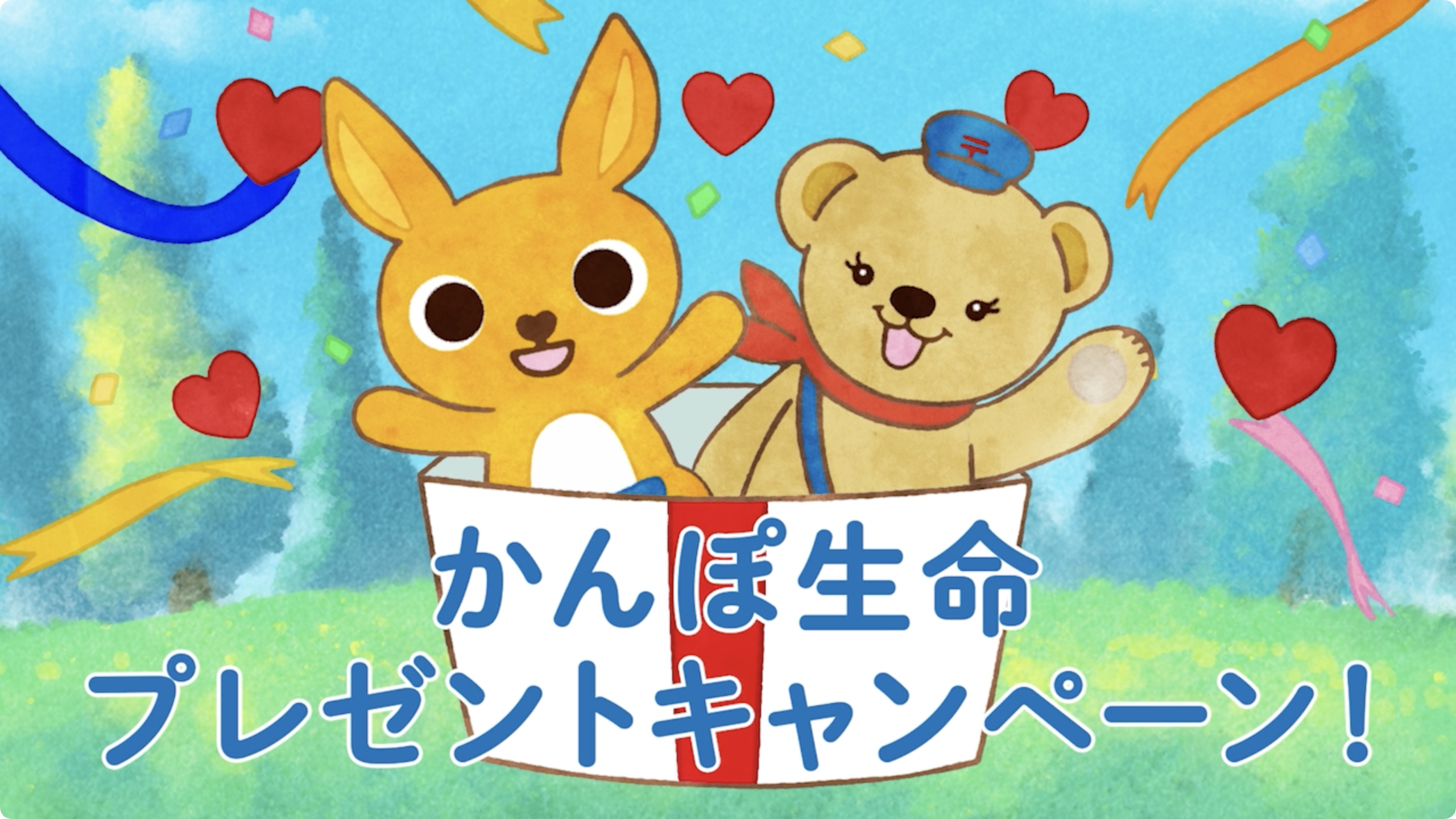 今回のWebCMでは、かんぽ生命の企業キャラクターである「かんぽくん」と「ゆめちゃん」「ゆめぴよ」、日本郵便の企業キャラクターである「ぽすくま」とその仲間たちがコラボレーション。郵便局との一体感を作りながら、「かんぽ 保険のご相談キャンペーン」への参加を呼びかける内容になっております。