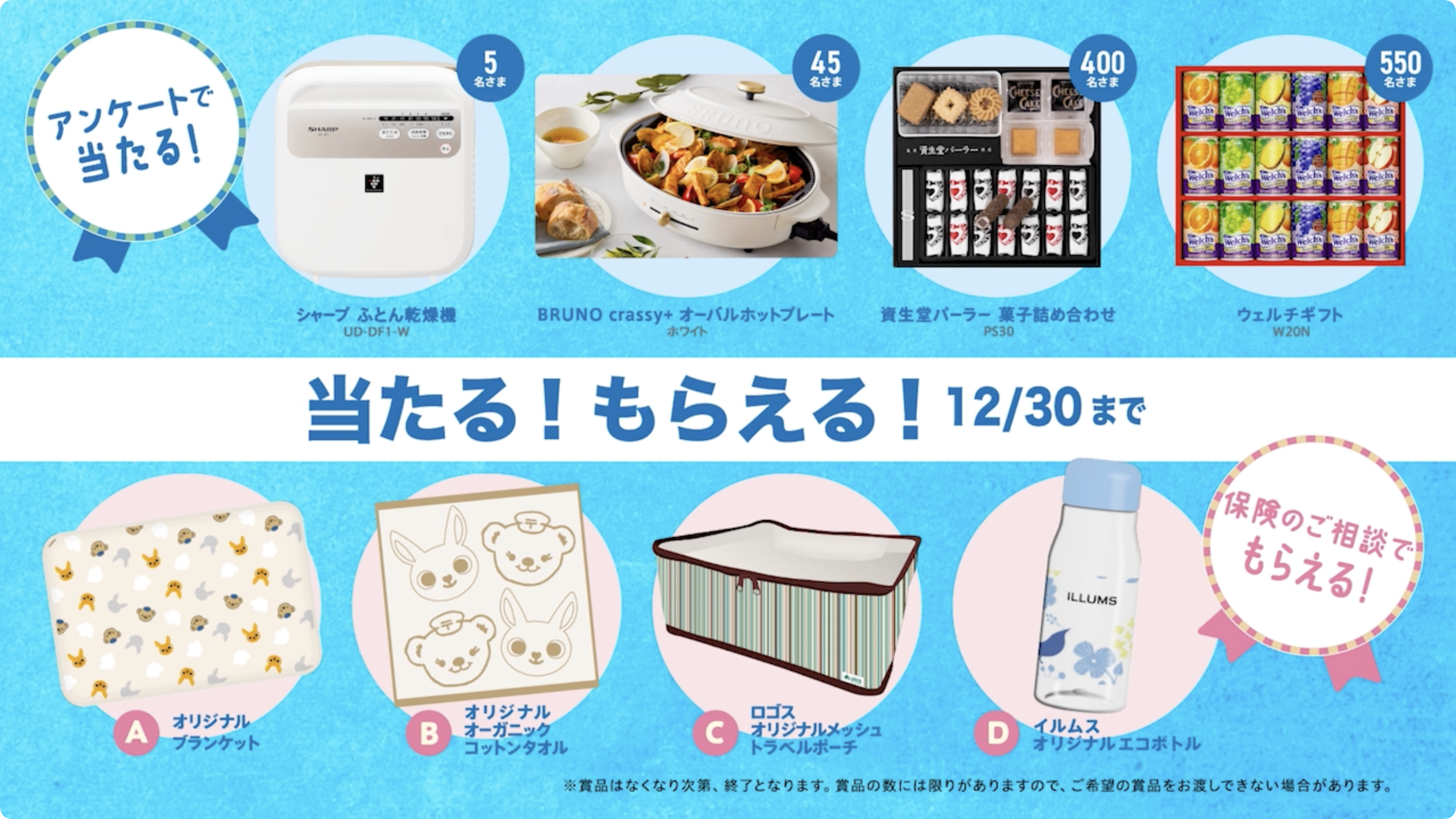 キャンペーン期間中、アンケート(チラシ)に回答した応募者の中から抽せんで豪華賞品を1,000名の方にプレゼント。また、保険相談として、ライフプランシート・保険商品の例示・保障設計書(契約概要)のいずれかを作成した方には、かんぽくん×ぽすくまグッズなどをいずれかお一つプレゼント。