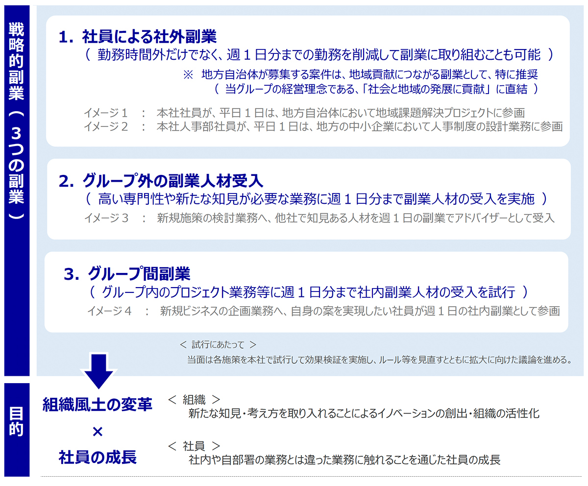 「戦略的副業」では、当グループ各社本社において、1.社員による社外副業、2.グループ外の副業人材受入および3.グループ間副業、の3つの副業を同時に試行開始します。