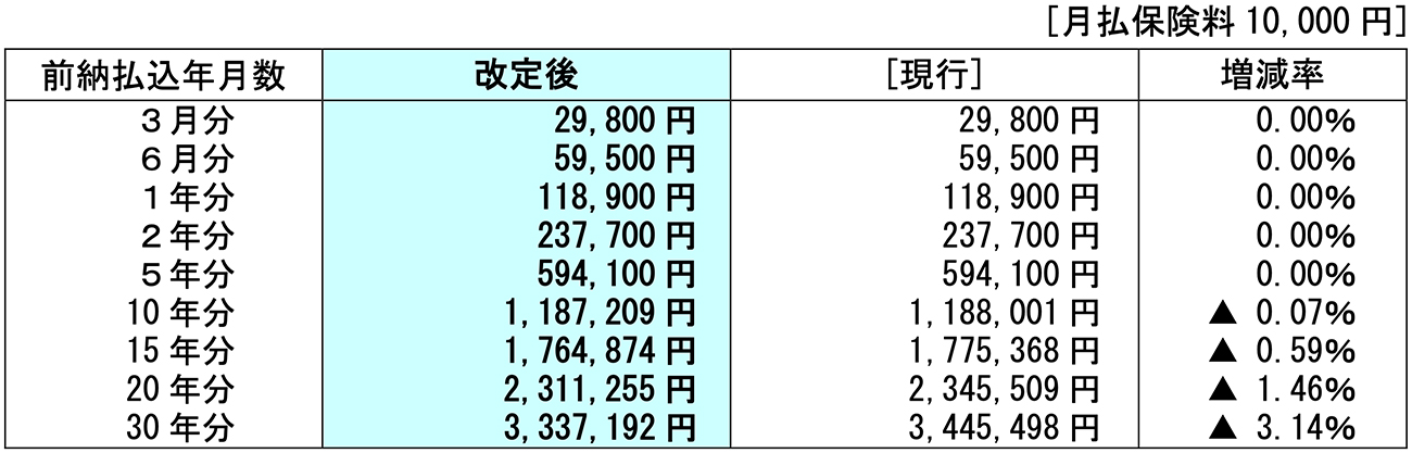 2023年4月1日以降に保険料の前納払込みをしていただく場合の前納払込保険料について改定します。ただし、2023年3月31日までに新規契約・契約の更新を申込みいただき、申込時にご指定いただいた払込年月数どおりに、第1回保険料を含む保険料の前納払込みをしていただく場合は、払込時期が4月以降であっても改定前の前納払込保険料を適用いたします。