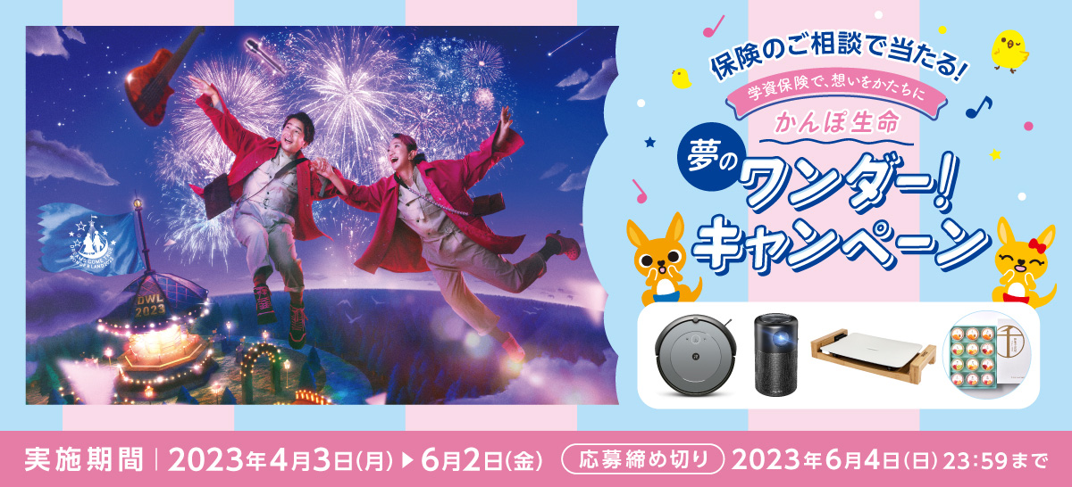 本キャンペーンでは、郵便局・かんぽ生命で保険のご相談をいただいた方(別紙の応募条件を満たした方)を対象に、ドリカムの4年に1度のグレイテストヒッツライヴ『史上最強の移動遊園地 DREAMS COME TRUE WONDERLAND 2023』のコンサートペアチケットを1,140組2,280名さまに、またアイロボット ルンバi2グレーなど豪華賞品を1,020名さまに、総計3,300名さまにプレゼントいたします。また、かんぽ生命の企業キャラクターたちがキャンペーンの魅力を伝えるWebCMも公開いたします。