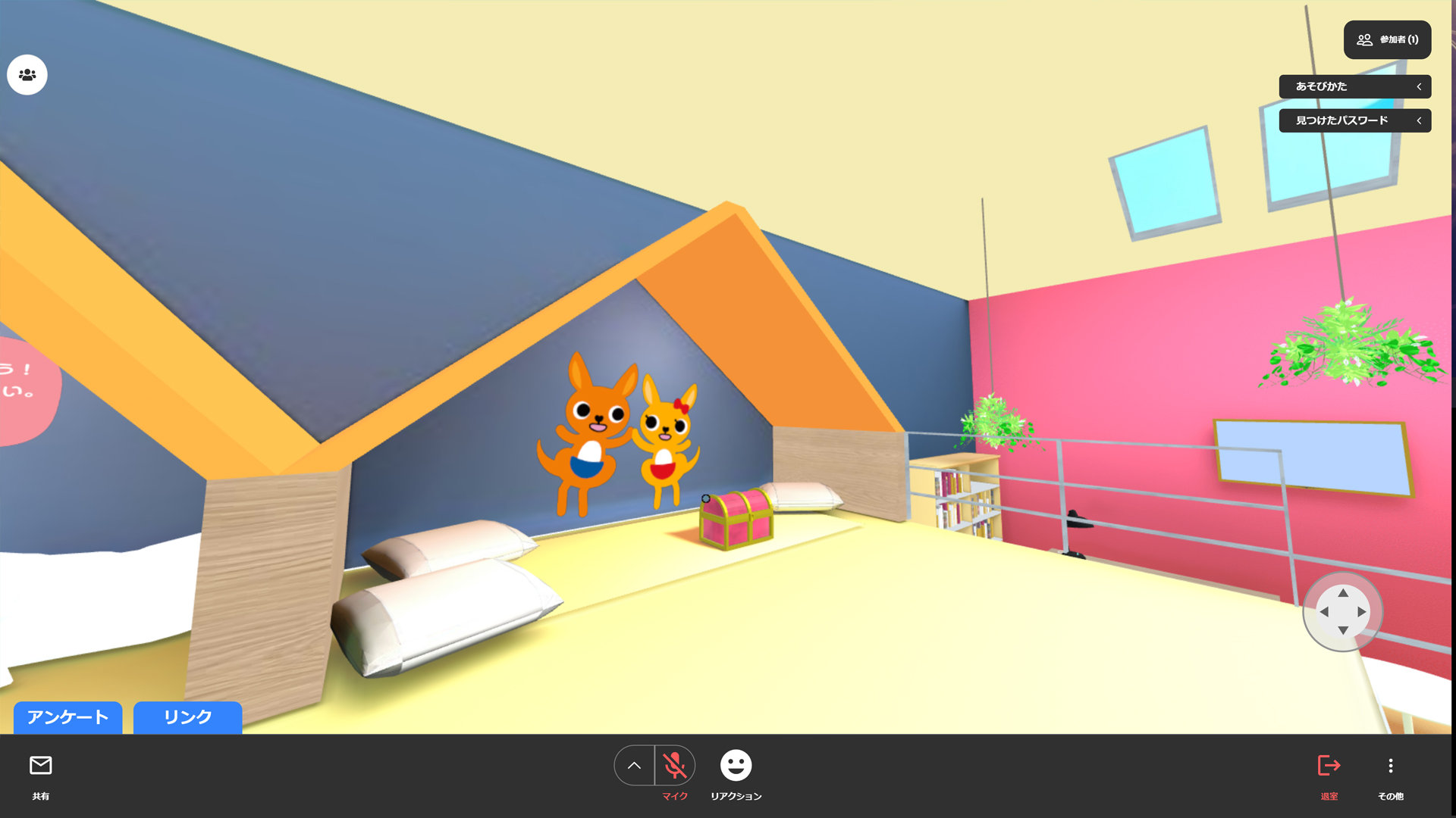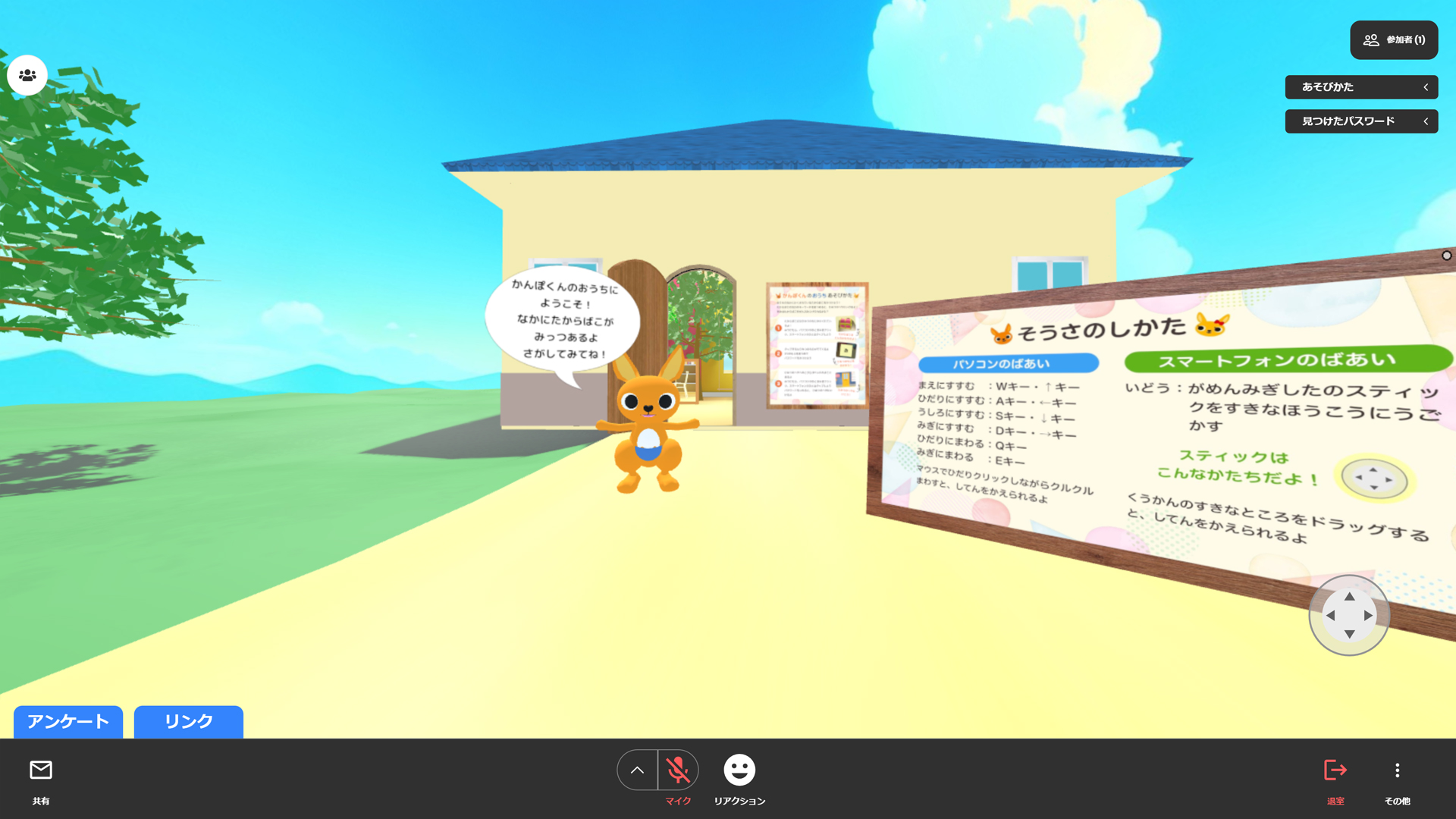 「メタバース空間」は、未就学児のお子さまがおひとりでも複数名でも安全に遊べる環境となっており、おうちの中で『宝探し』や『ラジオ体操』などをかんぽ生命の企業キャラクター「かんぽくん」や「ゆめちゃん」と一緒に体験することができる世界観となっています。
