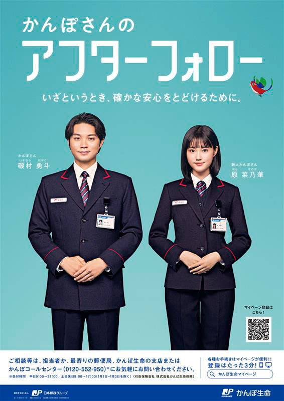 株式会社かんぽ生命保険(東京都千代田区、取締役兼代表執行役社長 谷垣邦夫、以下「かんぽ生命」)は、イメージキャラクター「かんぽさん」を演じる磯村勇斗(いそむら はやと)さんと新たに「新人かんぽさん」として原菜乃華(はら なのか)さんを起用した新TVCM「3色の鳥・かんぽさんのアフターフォロー」篇(60秒・30秒・15秒)を11月20日(水)から全国で放送します。