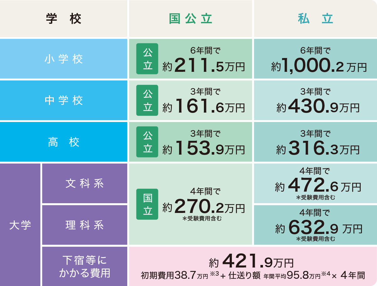 子:1人(4月生まれ)/幼稚園から高等学校(全日制)まで公立、大学は私立文科系に進学のご家庭の場合