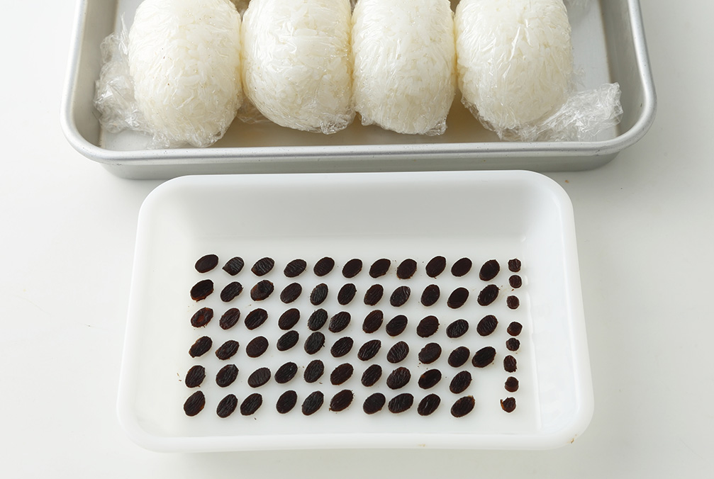 塩をかけて8等分したご飯は俵型に握り、目、耳、鼻、手足の形に切った昆布を貼る -