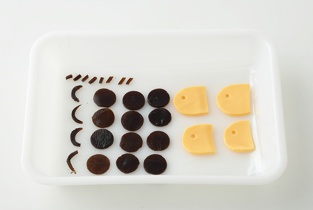 スライスチーズで鼻、昆布で目と体の模様を作る -