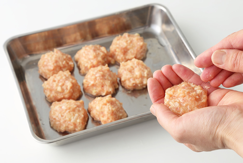 肉だねを12等分に分けて丸めるPoint!手に軽くサラダ油(分量外)をつけると丸めやすいです。