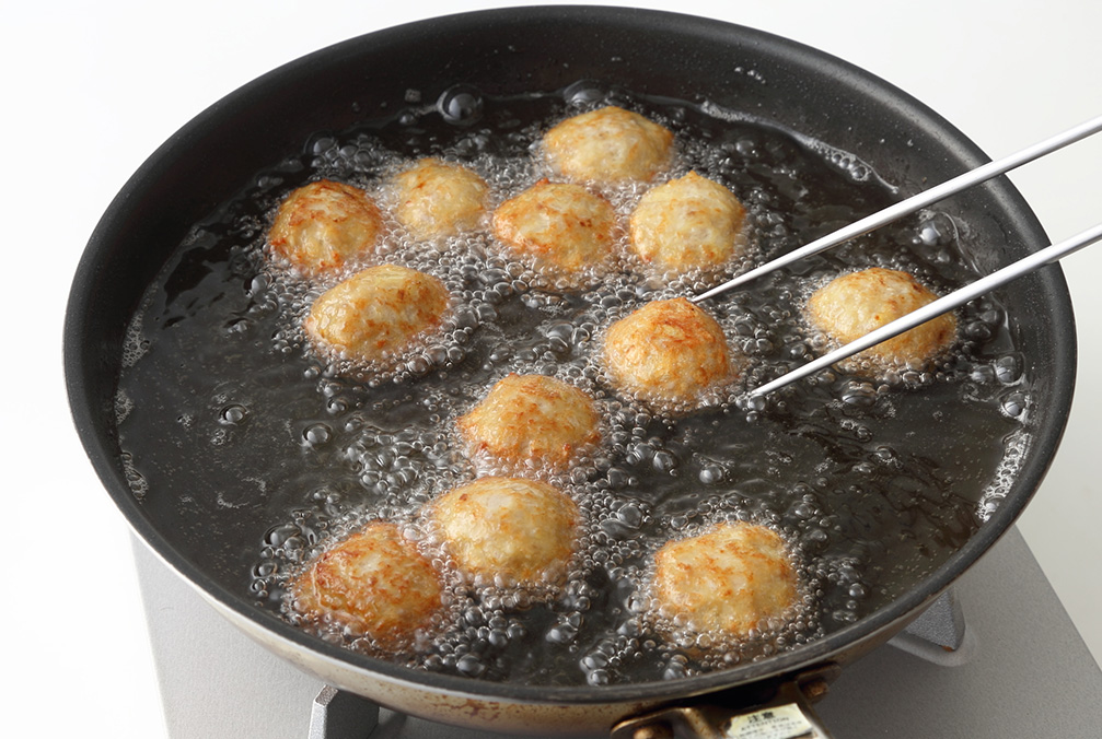 フライパンに深さ2㎝ほどの揚げ油を入れて170℃に熱し、⑥を入れて転がしながら4分ほど揚げる -