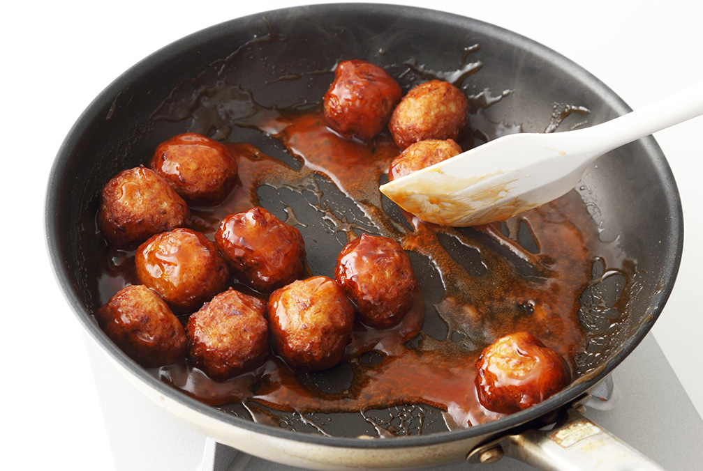 別のフライパンで◆の材料を混ぜたものを中火にかけ、煮立ったら揚げたミートボールを入れてあんをからめる -