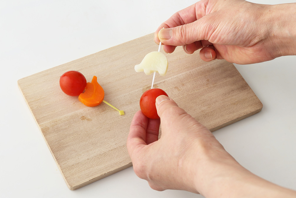 塩ゆでしたじゃがいもとにんじんは動物の抜型で抜き、ミニトマトと一緒にピックで刺す -