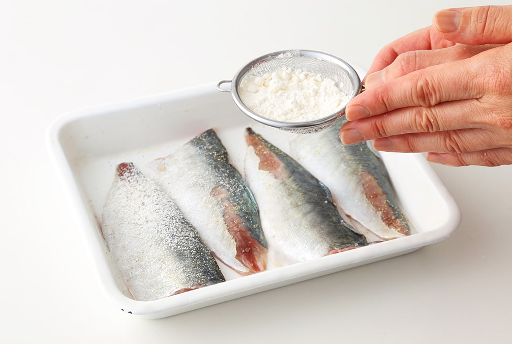 アジは三枚におろして塩・こしょう少々をふり、小麦粉を全体にまぶす