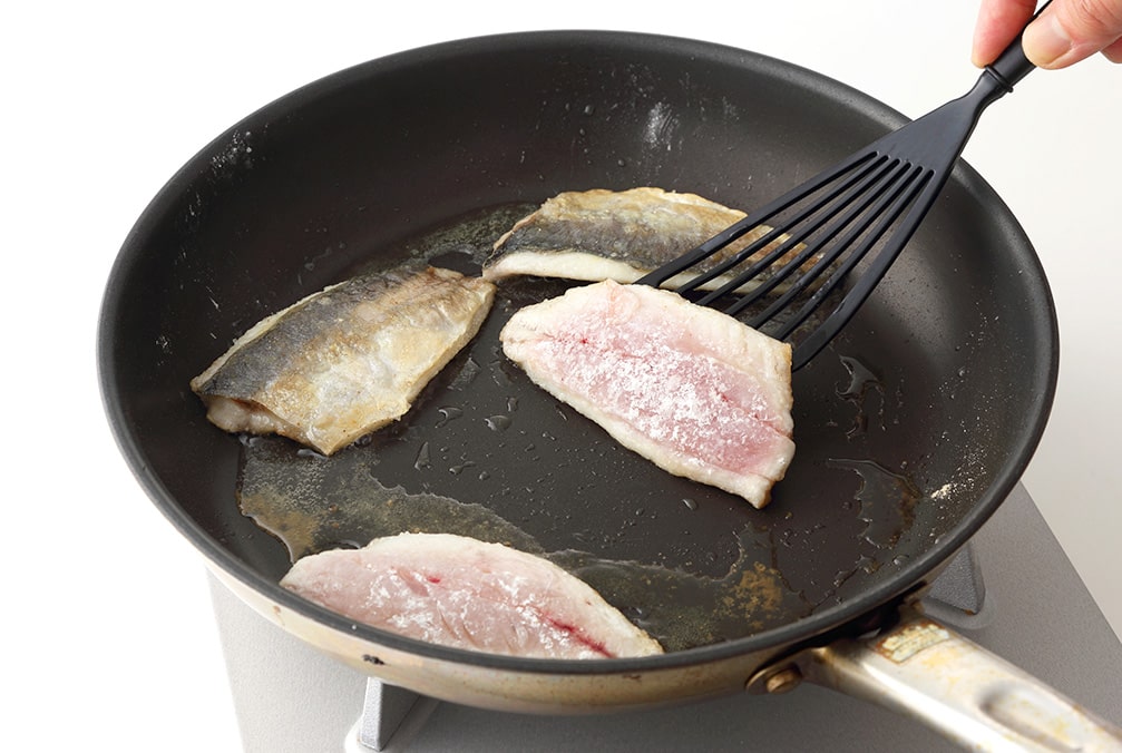 フライパンに大さじ1/2のオリーブオイルを入れて中火に熱したらアジを並べ、上下がきつね色になるまで焼いたら器に取り出す