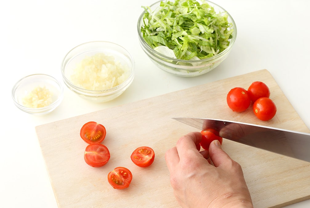 にんにくと玉ねぎはみじん切り、レタスはせん切りにし、ミニトマトは半分に切る