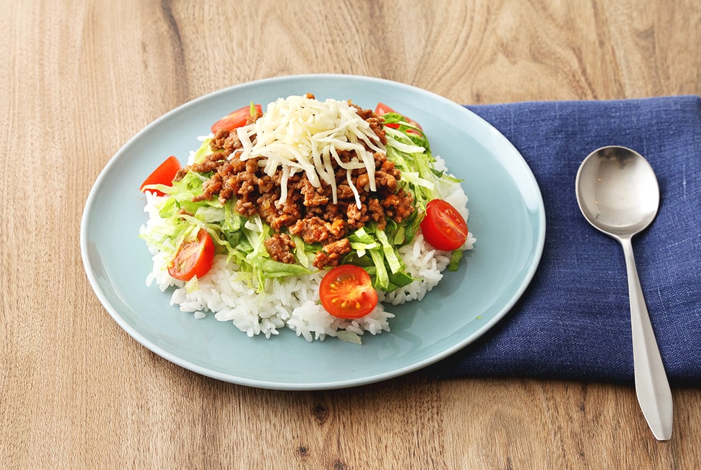 器にご飯を盛り、レタス、ミートソース、ミニトマト、ピザ用チーズを乗せて完成