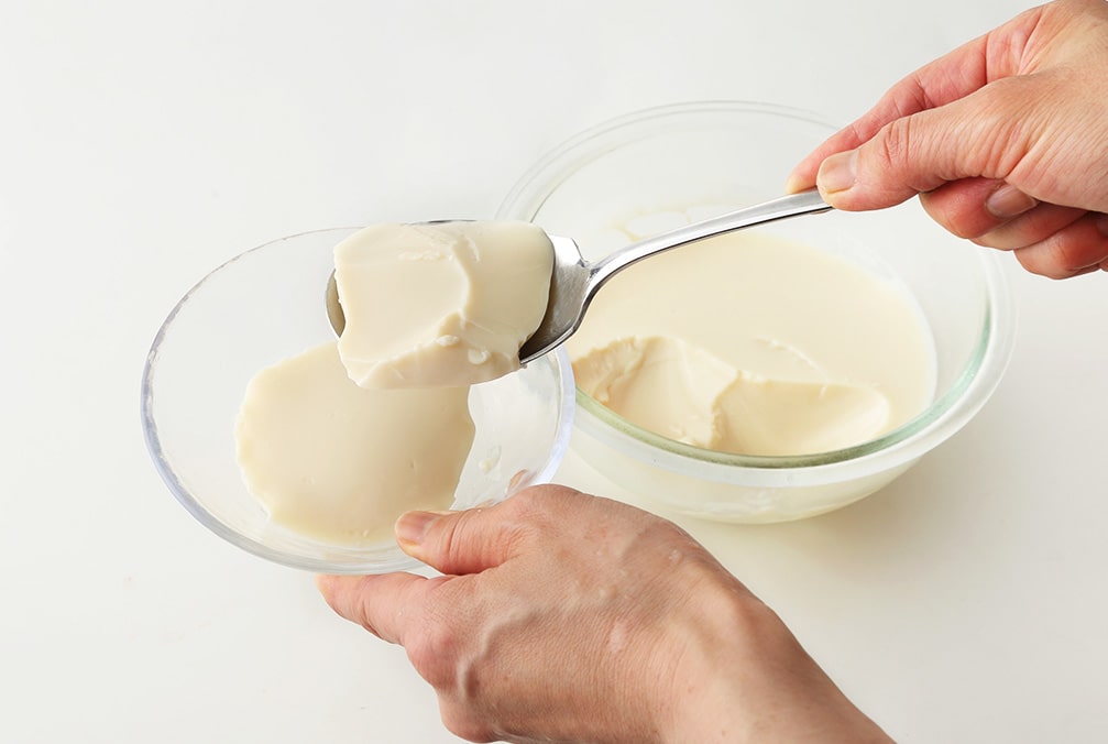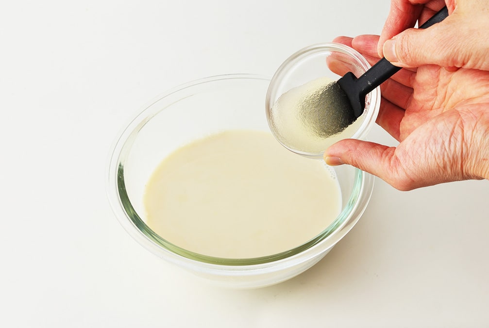 熱くなった豆乳にゼラチンを混ぜて溶かし、粗熱を取って冷蔵庫で3時間以上冷やし固める