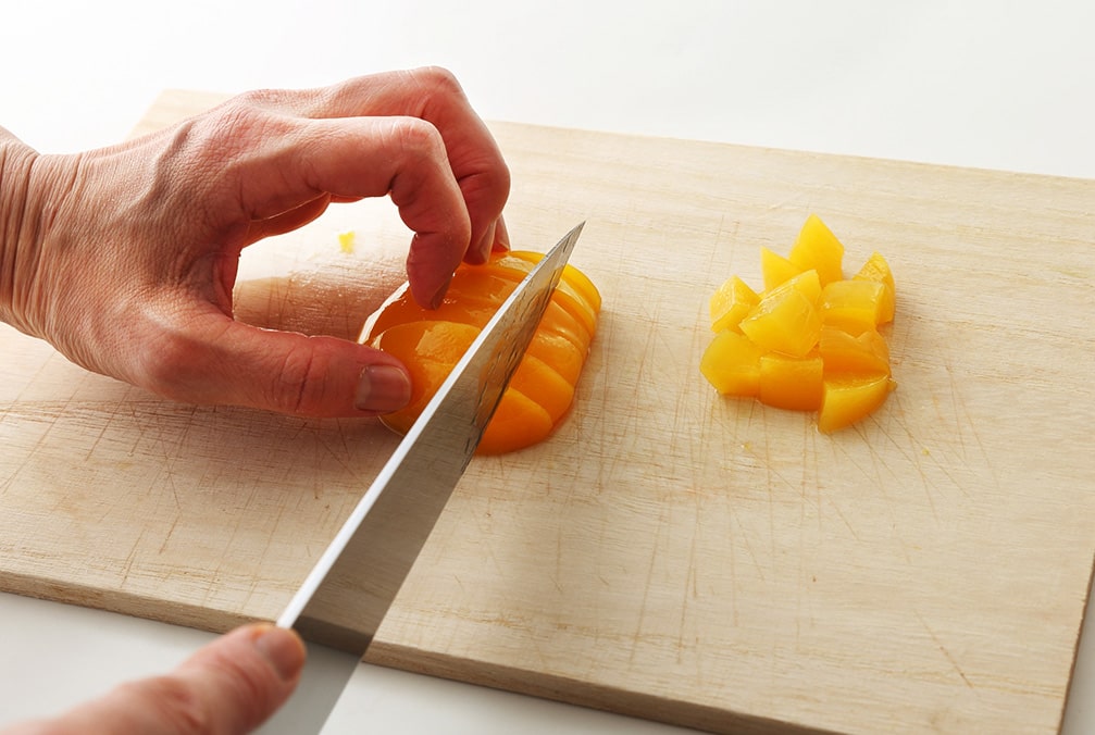 はちみつと水50mlを混ぜて作ったシロップは冷蔵庫で冷やし、黄桃は1cm角に切る