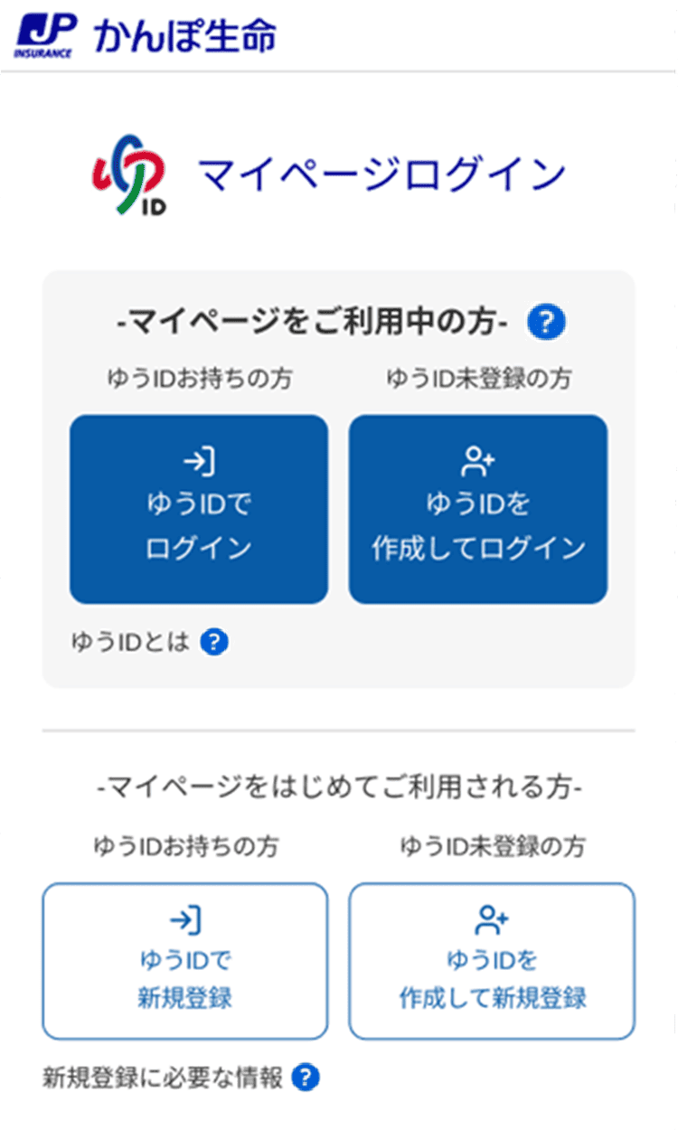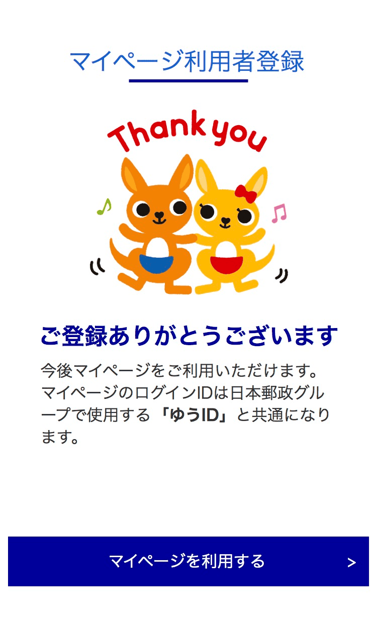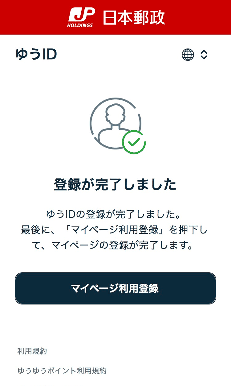 マイページログイン画面「-マイページをはじめてご利用される方-」の「ゆうIDを作成して新規登録」からゆうIDを作成後、作成したゆうIDでログインいただき、マイページの登録を行ってください。