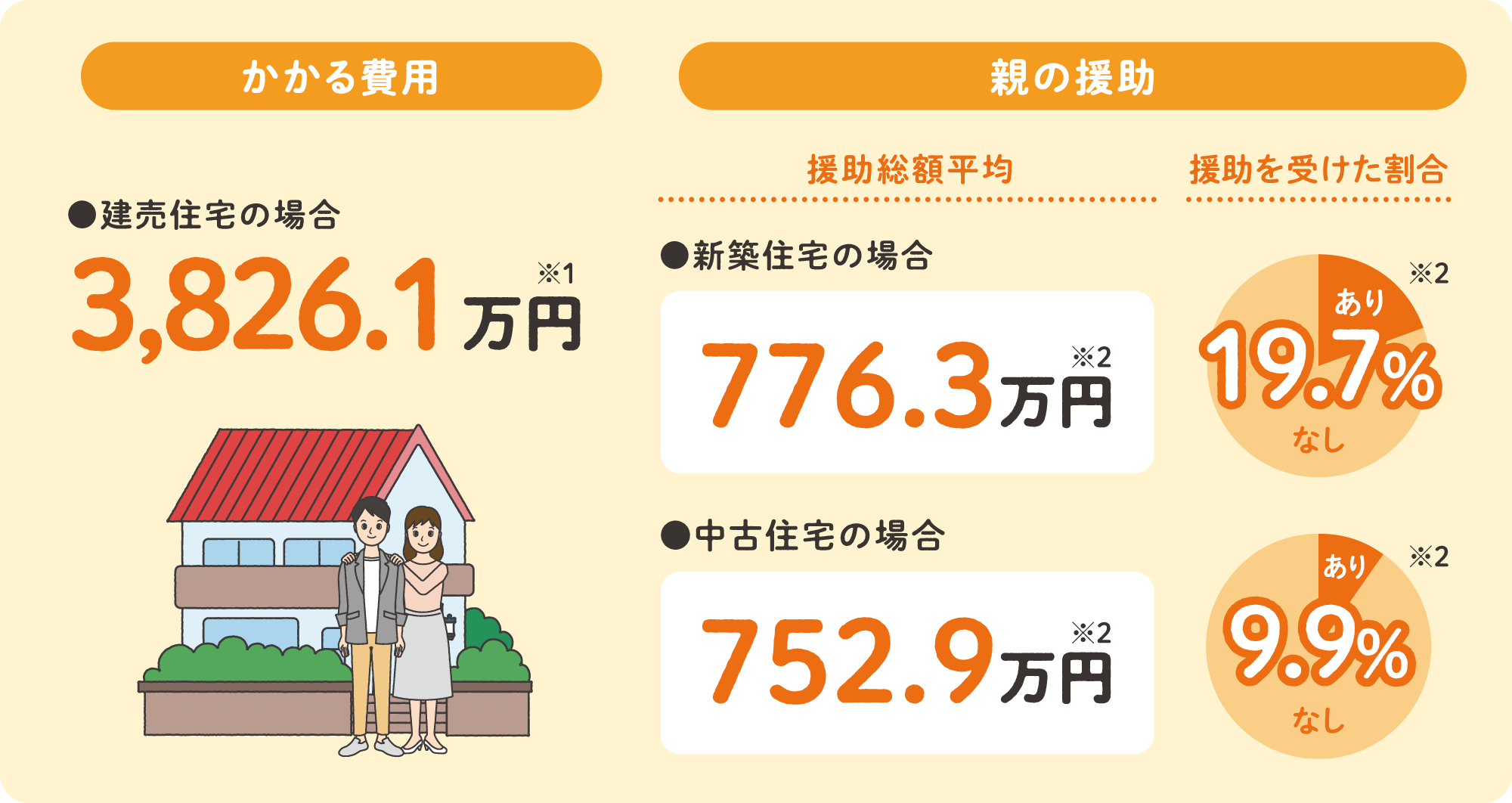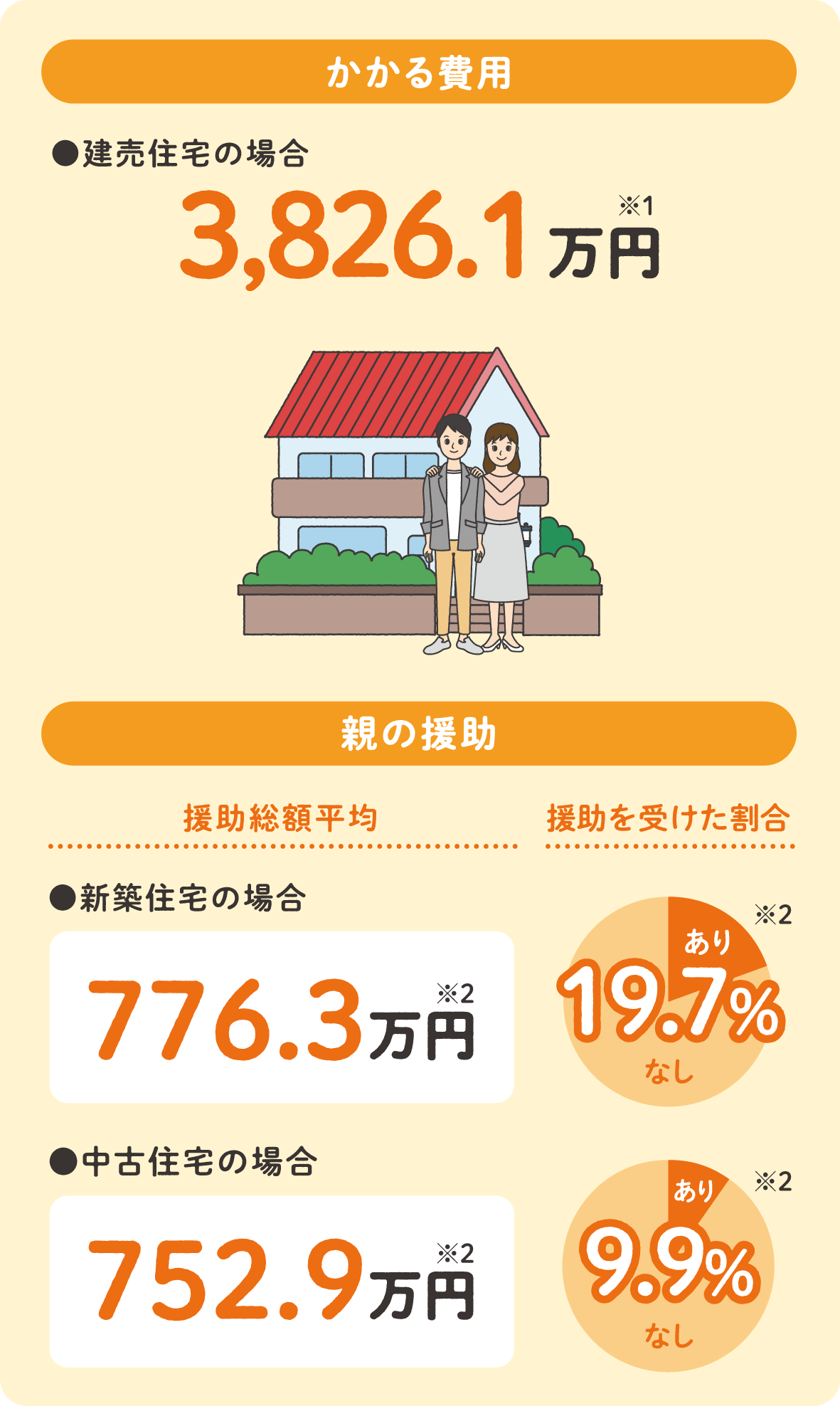 マイホーム費用の場合 子どもの住宅購入時の援助費用 その費用、計画的に備えることが重要です。 ※1独立行政法人 住宅金融支援機構「2024年度 フラット35利用者調査」 ※2一般社団法人 不動産流通経営協会「不動産流通業に関する消費者動向調査(第29回(2024年度))」を基に、同資料中の「贈与」を「援助」、「既存住宅」を「中古住宅」とかんぽ生命が加工して作成 マイホーム購入に向けて備えておきたい商品例 トップに戻る ⅢW 2025.10 18021