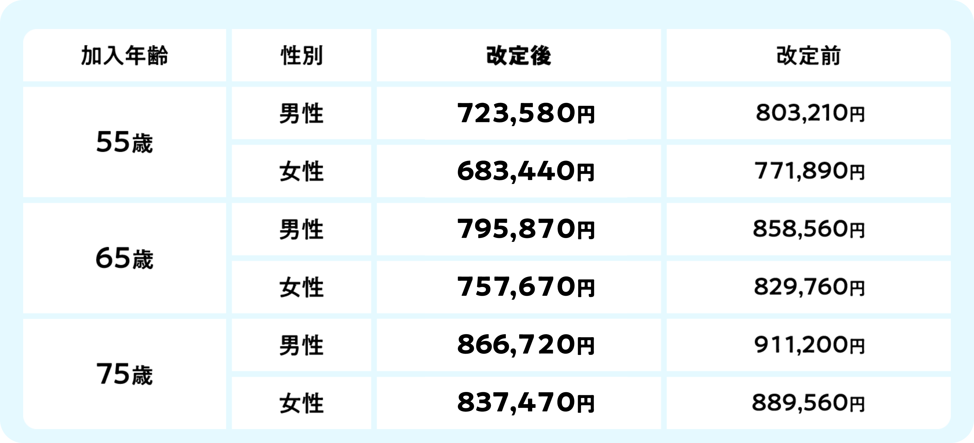 *予定利率※6の改定に伴い、一時払終身保険の保険料を改定します。例えば、死亡保険金100万円65歳女性の場合、改定前保険料829,760円が改定後保険料757,670円になります。