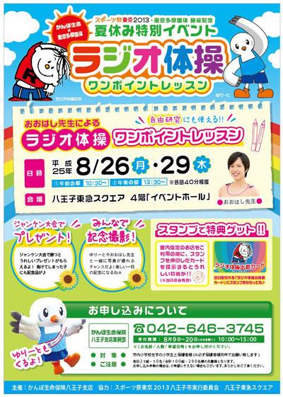 かんぽ生命八王子支店が、ラジオ体操指導委員の大橋美加さんと、八王子市内のお子様、その親御様を対象に八王子支店がある東急スクエアの4階イベントホールで「ラジオ体操☆おでかけワンポイントレッスン」を行いました。