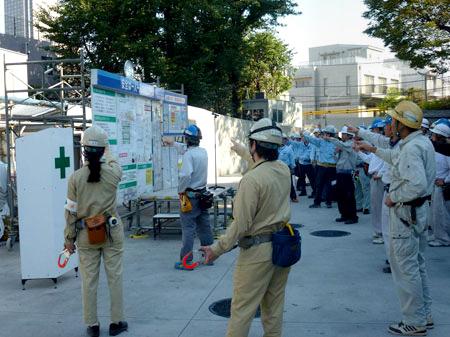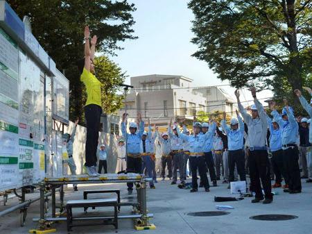 株式会社竹中工務店さまは、建設事業、開発事業を営むなかで、さまざまな建築プロジェクトを手がけていらっしゃいます。今回レッスンを行った作業所(建築現場)では、毎朝8:15の朝令時に、「新しい朝がきた」のイントロ音楽が合図となり、現場の皆さま全員で、仕事の前の準備運動として、元気よくラジオ体操をされているそうです。