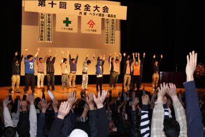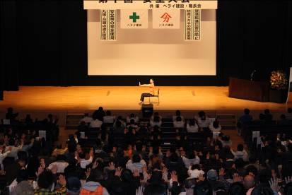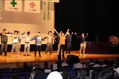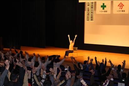 2014年4月6日に越谷サンシティホールにて開催された会社の年中行事である安全大会において、おでかけワンポイントレッスンを行いました。ホールには400名を超える社員の皆さまが集まり、その中から代表として13名の社員の方に壇上に上がっていただき、ラジオ体操第一のポイントレッスンを25分程実施しました。その後、参加者全員で座ったままで出来る体操を15分ほど実施しました。