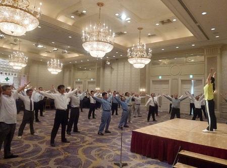ワンポイントレッスンは14:30から45分間行われました。まず初めに小坂さんより日常生活で活用できるストレッチの紹介があり、準備運動として体を整えました。その後、ラジオ体操第一のレッスンを開始。皆さま各企業で朝ラジオ体操を行われているだけあって、スムーズに体を動かされていましたが、小坂さんのレッスンで改めて正しい動きや効果を実感されたようで、とても真剣にレッスンを受講されていました。