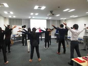 ワンポイントレッスンは9時から30分間行われました。参加された社員は大半が20代の若い営業担当者17名の皆さんです。「ラジオ体操は小学校以来」という方が多く、小野さんから一つひとつの動作にはすべて意味があり、どこの筋肉にどう作用するのか説明を交えながら、基本動作を学びました。