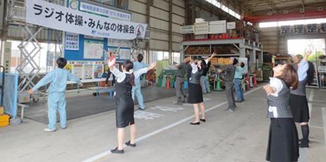株式会社エスシー・マシーナリさまは、建設機械のレンタル事業等を行っている会社です。屋外での立ち仕事が多いため、ラジオ体操を朝礼時に行い体を十分にほぐしてから、機械の整備作業に取りかかるそうです。また、体調管理になるためラジオ体操で体の動きも確認していらっしゃいます。