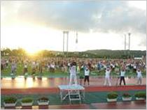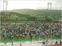 南風原町町制施行30周年を記念して「夏期巡回ラジオ体操・みんなの体操会」が開催されました。 早朝からの開始にもかかわらず約2,500人が参加し競技場を埋め尽くしました。 参加者は一斉に体を動かし早朝から心地よい汗を流しました。