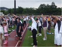 西東京市誕生10周年を記念し、西東京市向台運動場において約2,050人の皆さまにご参加いただき「夏期巡回ラジオ体操・みんなの体操会」が盛大に開催されました。心配された前日からの雨も早朝にはあがり、被災地に届けとばかりに元気な声で爽快な汗を流しました。 ![]() ![]() |