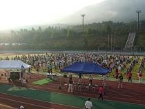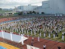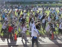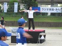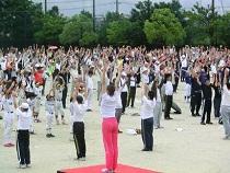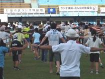 あいにくの雨の中の実施となりましたが、生放送3分前に雨足が弱まり、参加者1,828人が晴天会場のグラウンドで元気にラジオ体操を実施することができました。 ![]() ![]() |