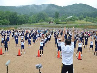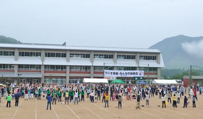 6月19日(日)に大阪府能勢町立能勢小学校・中学校において「特別巡回ラジオ体操・みんなの体操会」を開催しました。町制施行60周年を迎える能勢町は大阪府の最北端に位置する人口およそ1万1千人の町。四方を高い山々に囲まれ、樹齢1000年とも言われる「野間の大けやき」や、山の斜面に開かれた美しい棚田など、古き良き日本の風景と豊かな自然が残されています。