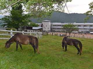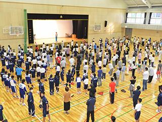 あいにくの小雨模様にもかかわらず、今年4月に開校した町立能勢小学校・中学校のグラウンドには、小学校の児童たちや中学校の生徒たち、地域の方など約1500名が集まりました。牧場跡地に建てられた校舎を馬たちが悠々と眺めるなか、NHKのラジオ体操放送開始にあわせてラジオ体操が始まりました。本番前に雨が強くなったため、グラウンド、中学校体育館、小学校体育館に分散しての生放送となりました。