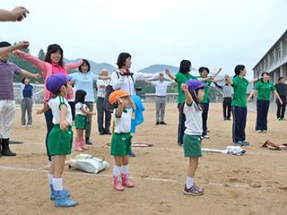 幸いラジオ体操放送終了後に雨がやみ、参加者はグラウンドに再び集合し、ラジオ体操ポイントレッスンに参加しました。ポイントレッスンでは、講師の多胡先生やアシスタントの天井澤さん、舘野さんのお手本に注目し、小学校や中学校の生徒たちを中心に、地域の方たちが気持ちよさそうに体を動かしました。
