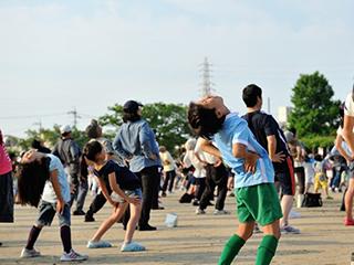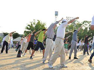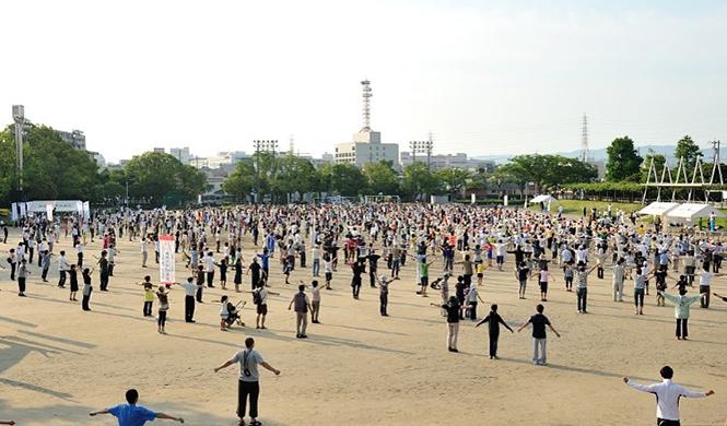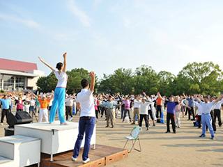 6月26日(日)に愛知県岡崎市六名公園運動場において「特別巡回ラジオ体操・みんなの体操会」を開催しました。岡崎市は県の中央部に位置する人口およそ38万人のまちです。今年市制100周年を迎えますが、徳川家康が誕生した岡崎城をはじめとする数多くの歴史資産があり、多くの方が訪れています。