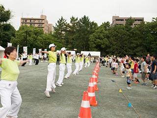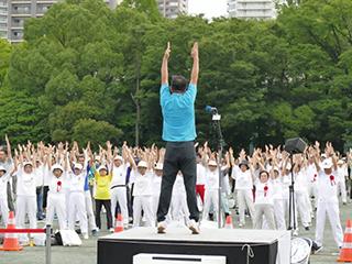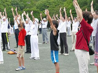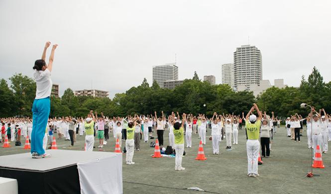 7月20日(水)に東京都江東区の都立木場公園多目的広場において「夏期巡回ラジオ体操・みんなの体操会」を開催しました。江東区は東京湾に面していて、人口はおよそ50万人。隅田川が流れ、ガラスの工芸品「江戸切子」や、水上で角材を操る民俗芸能「木場の角乗り」など江戸の歴史や文化が色濃く残っています。また、2020年の東京オリンピック・パラリンピックでは、豊洲や有明などで多くの競技が開催される予定です。
